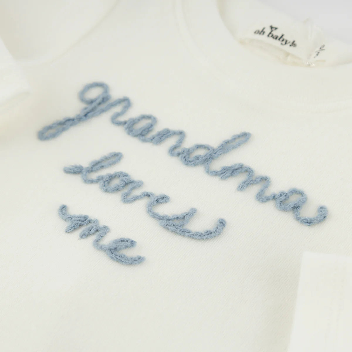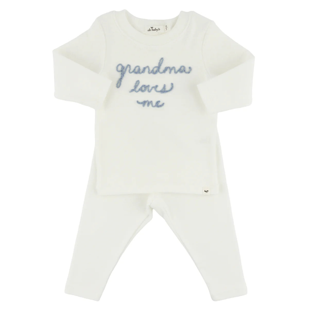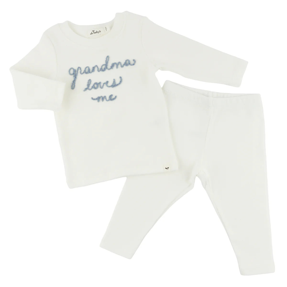 Say hello to comfort and cuteness with the Grandma Loves Me 2pc Set by Oh Baby! This easy, two piece set features a soft white base color and is made from cozy cotton for ultimate comfort. The long sleeve shirt has a playful "Hello" graphic across the chest in either blue or pink, making it a cheerful addition to your little one’s wardrobe. The matching pants come with a comfortable elastic waistband for a perfect fit. Ideal for everyday wear, this set brings together style and comfort in one adorable outfit!