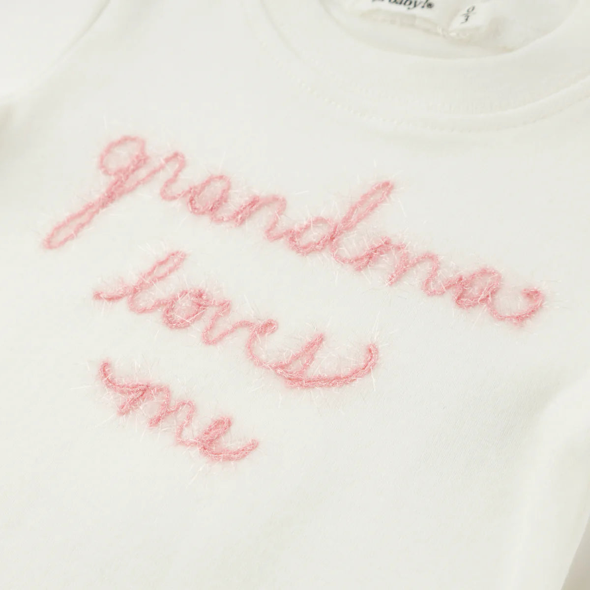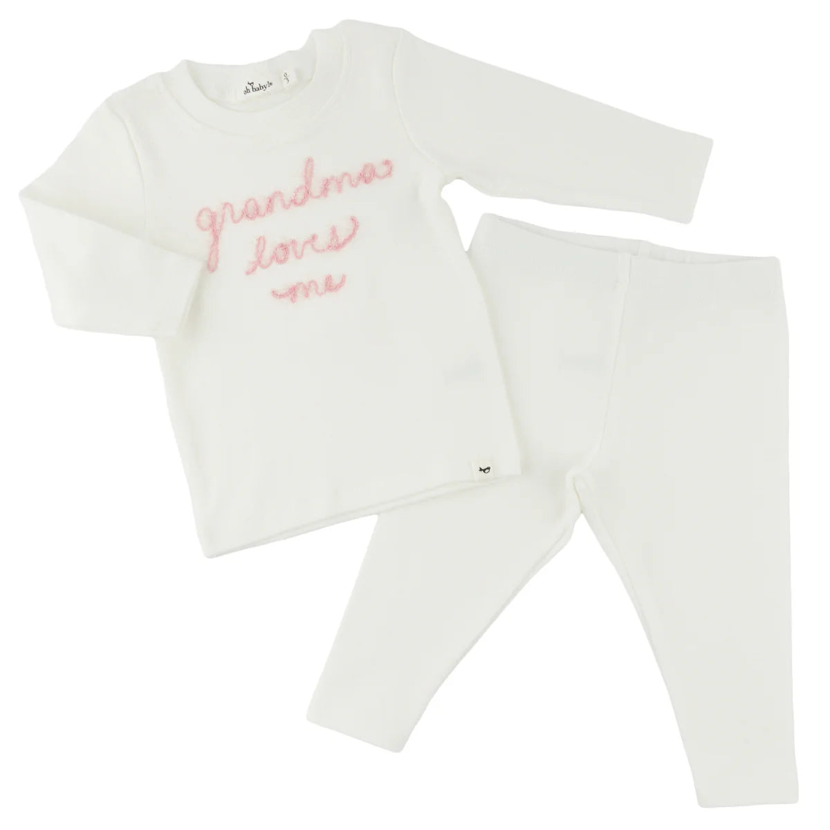 Say hello to comfort and cuteness with the Grandma Loves Me 2pc Set by Oh Baby! This easy, two piece set features a soft white base color and is made from cozy cotton for ultimate comfort. The long sleeve shirt has a playful "Hello" graphic across the chest in either blue or pink, making it a cheerful addition to your little one’s wardrobe. The matching pants come with a comfortable elastic waistband for a perfect fit. Ideal for everyday wear, this set brings together style and comfort in one adorable outfit!