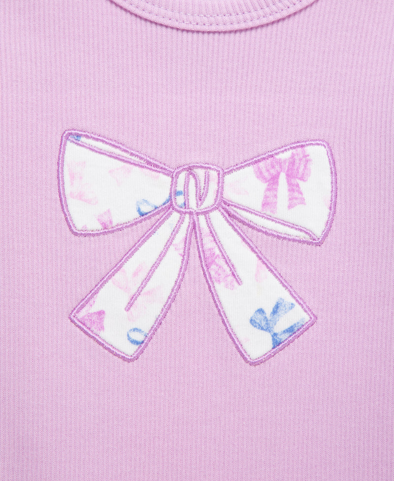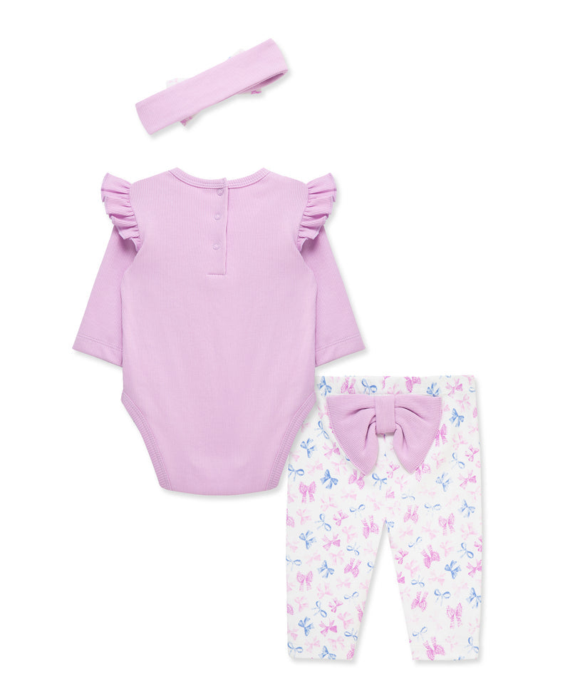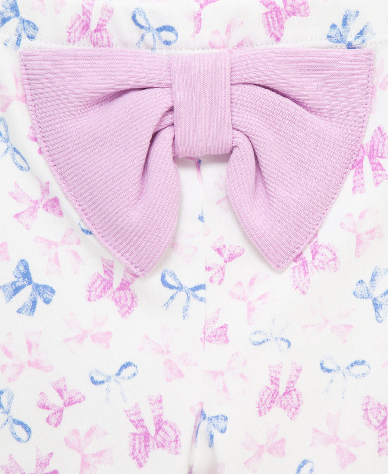 Your little one will be ready for play in our baby girls' purple bodysuit and pant set. The set includes an allover bow print pant, a bow motif bodysuit, and a matching headband.