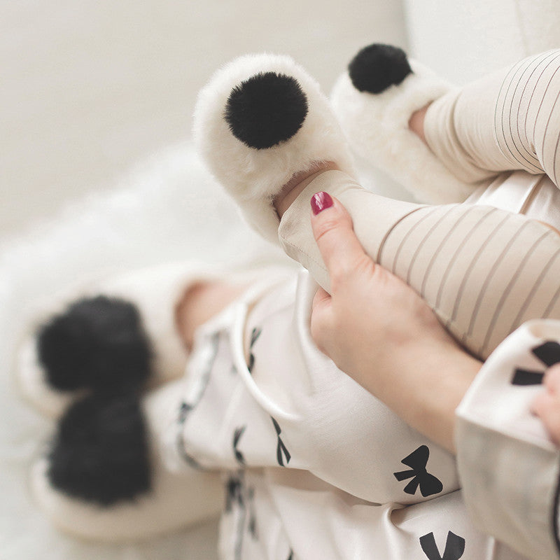 Keep your baby's tiny toes warm and stylish with Ivory Plush Slipper featuring adorable black pom poms! Designed to keep little feet cozy, these charming slippers are perfect for moments at home and playful outings. Ideal for babies in the non-walking stage.