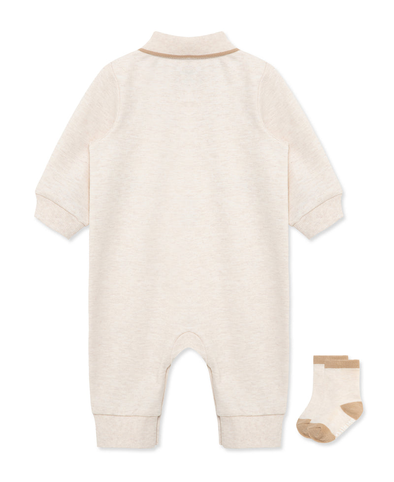 A comfy collared coverall that gives your baby boy room to explore and, with leg snaps for quick and easy diaper changes. Complete this comfy outfit with the matching socks.Coverall: 74% Cotton, 26% Polyester; Socks: 72% Cotton, 25% Polyester, 3% Elastane