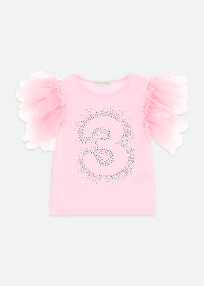 Beautiful fairy pink top with soft petal tulle sleeves made from a super soft cotton blend. Featuring gorgeous diamante hot stone number 1 design on the front so any birthday girl can stand out.