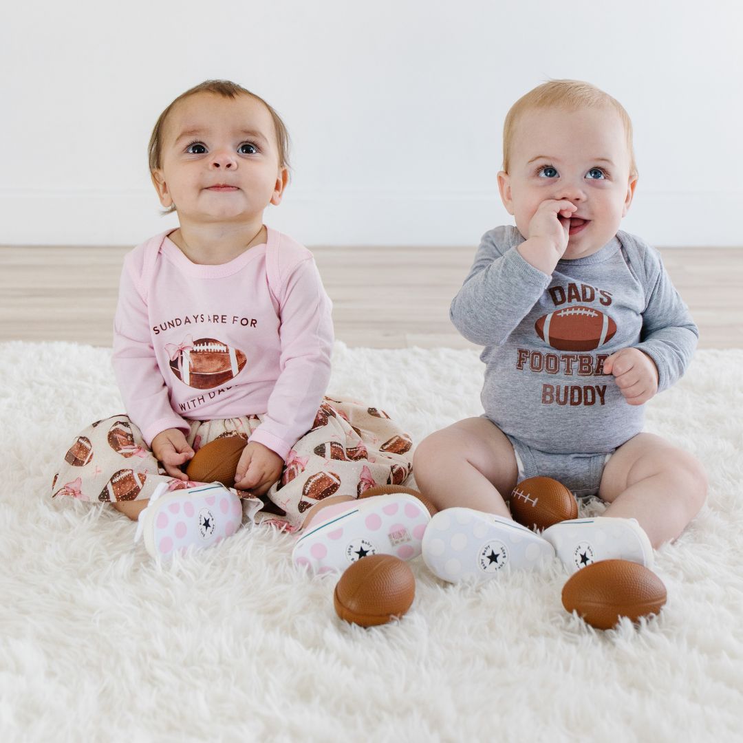 The Dad's Football Buddy Long Sleeve Bodysuit is a fun and cute bodysuit for babies celebrating Game Day!