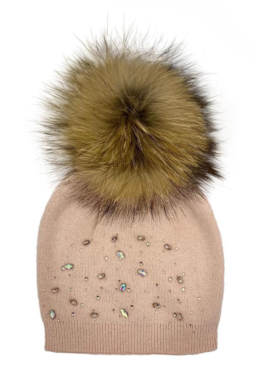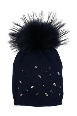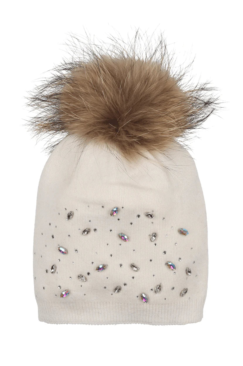 Grab this cozy pom beanie with sparkly rhinestones at the first sign of snowflakes this season.
