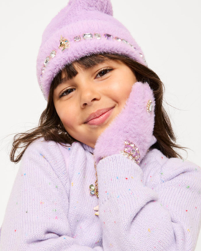Cozy up in lavender luxury! The Lavender Dreams Jeweled Beanie is soft, stretchy, and oh-so-sparkly—designed to keep kids (and grown-ups!) warm with a side of style. The brim is decked out in gleaming gems and heart-shaped accents that make cold-weather outfits feel extra special. Whether they’re heading out for snowy fun or just dressing up indoors, this beanie is a dreamy winter essential.