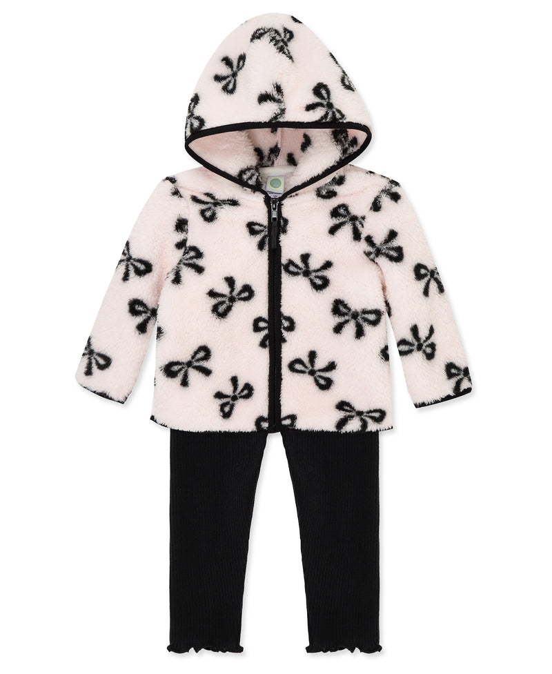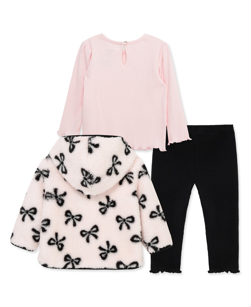 This adorable trio for girls is prepped to bring a sophisticated cute into colder weather with a cozy sherpa jacket, shirt and stretch leggings. Jacket: 100% Polyester; Shirt: 94% Cotton, 6% Spandex Knit Rib Pant: 75% Cotton, 20% Poly, 5% Spandex Denim