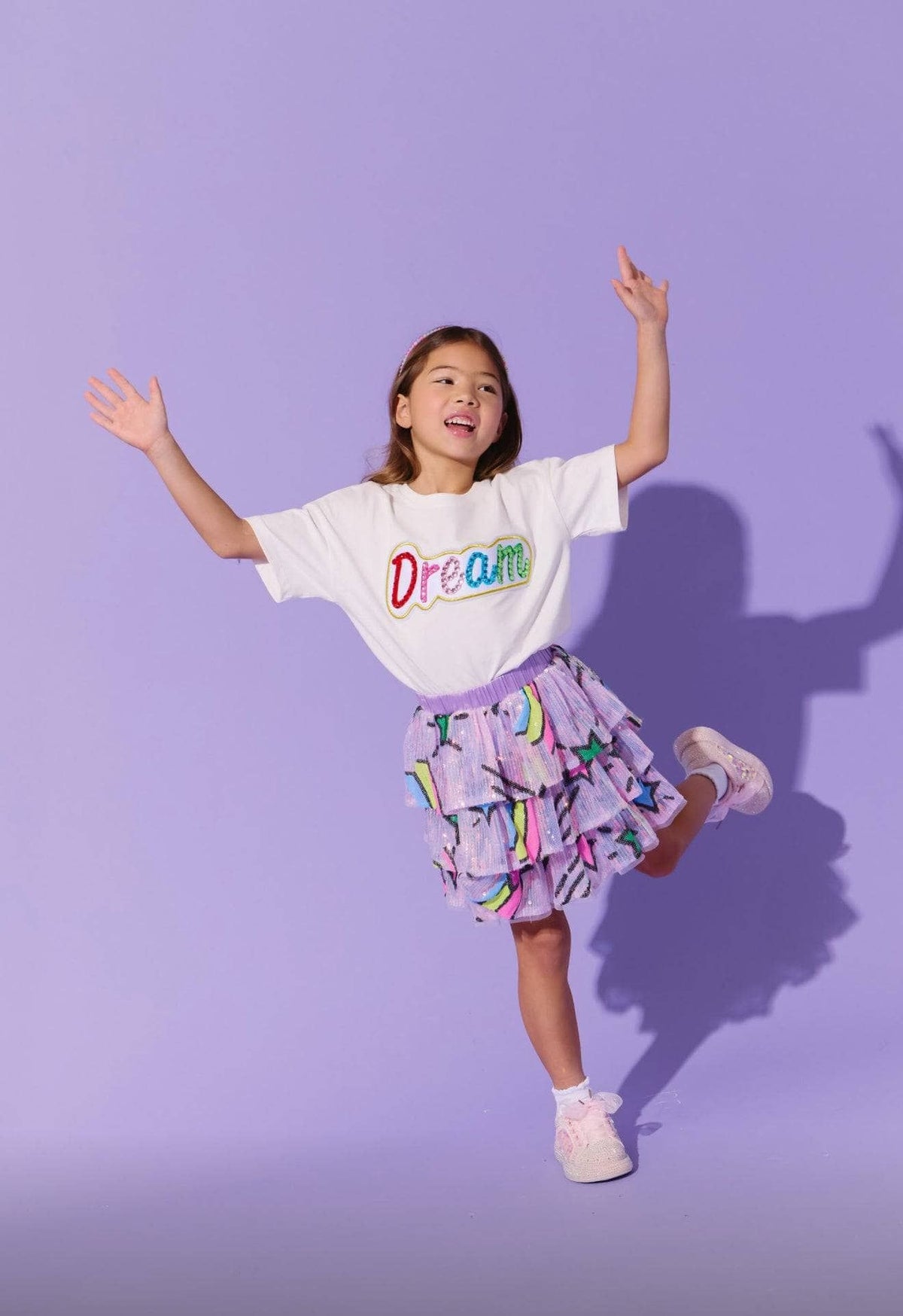 • Layered ruffle skirt with all-over iridescent sequins and bold shooting star designs