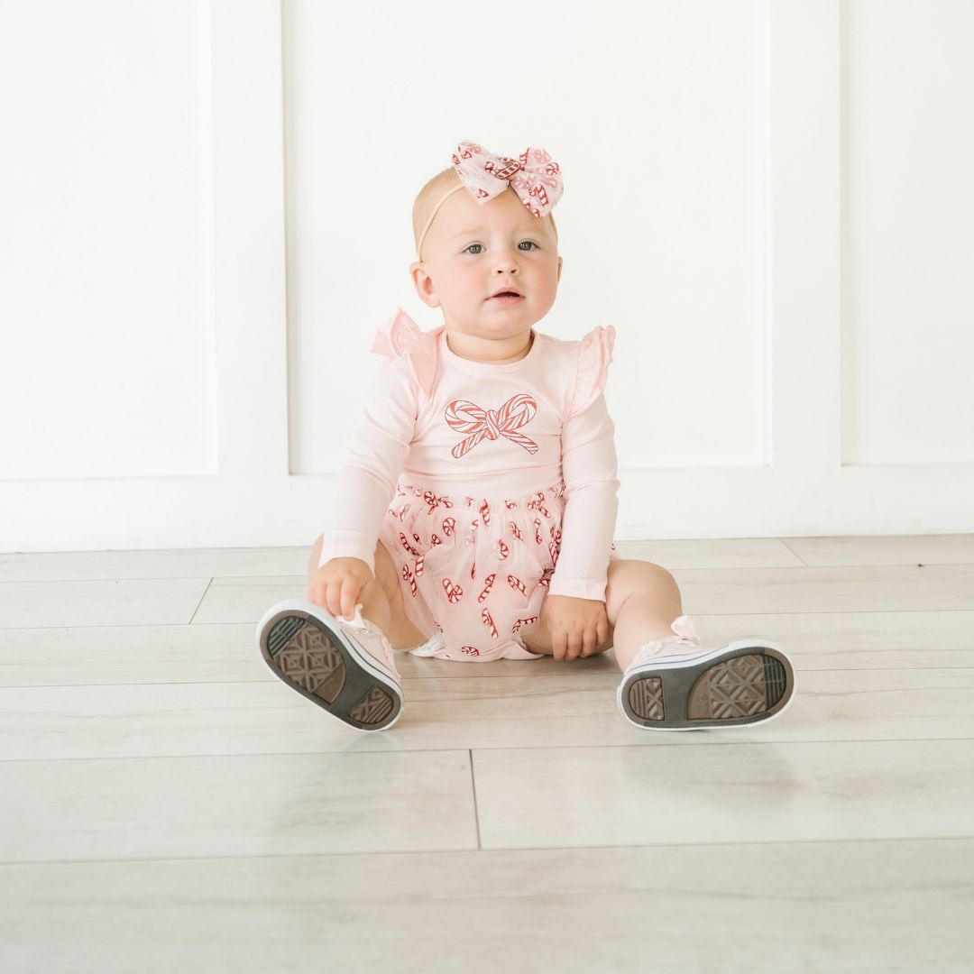 - Bodysuit Color: Blush pink cotton bodice with a candy cane bow
