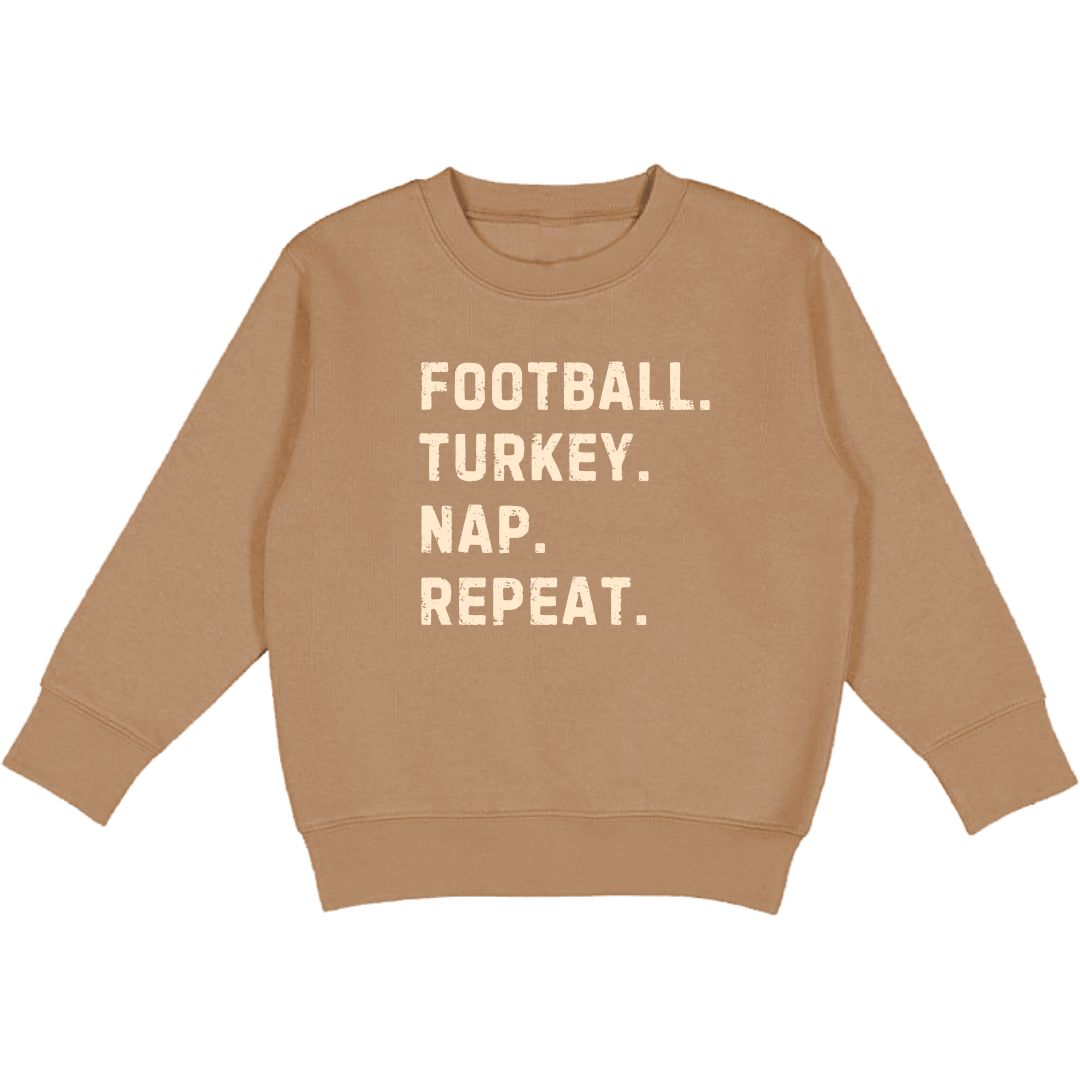 The Football Turkey Nap Repeat Thanksgiving Sweatshirt is a fun and festive sweatshirt for celebrating Thanksgiving!