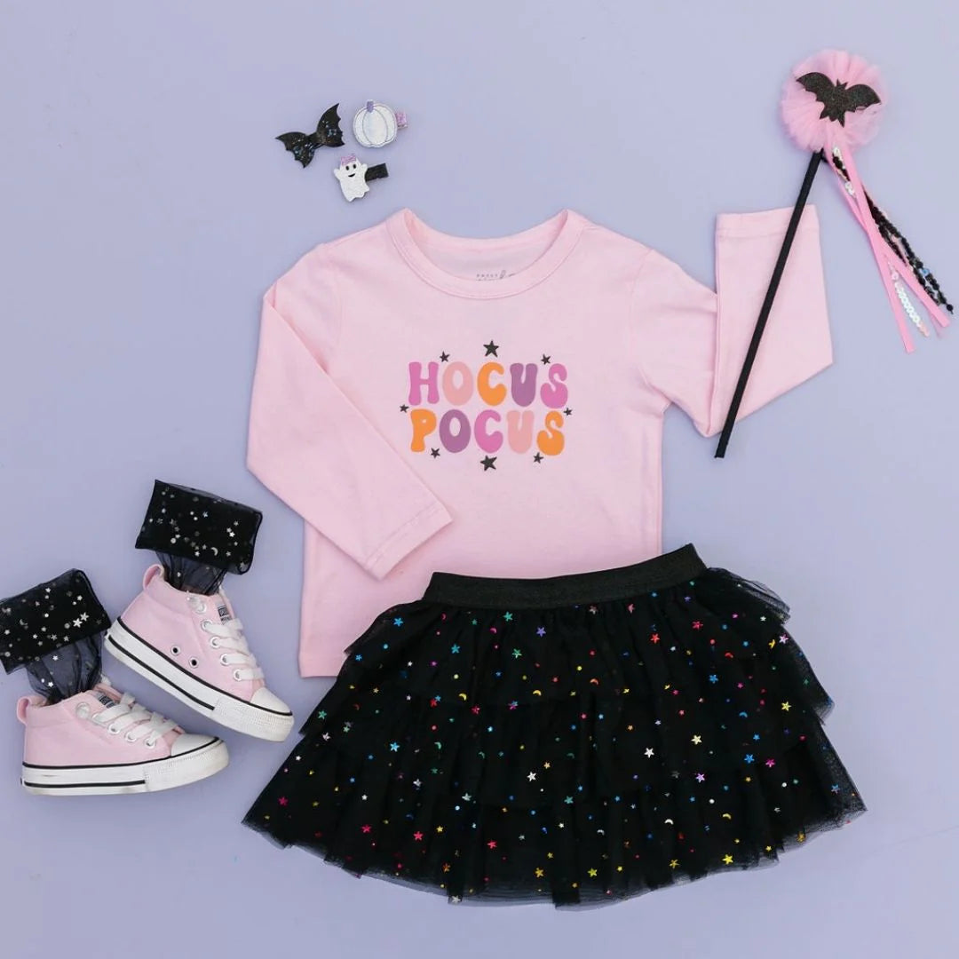 The Hocus Pocus Halloween Long Sleeve Shirt is a fun and festive shirt for kids celebrating Halloween!