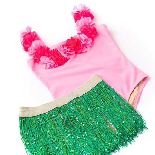 Is there anything sweeter than a light pink hula girl lei and fringe skirt swim set for your little girl? We think not! Now your daughter or granddaughter can look and feel like a ray of sunshine in this beautiful one-piece and coordinated hula skirt. Perfect for playing at the pool or beach or even an impromptu hula dance party. The fringe grass skirt adds texture and movement as she runs and twirls. They'll love having extra fun with the built in hula lei that comes attached to the suit. This swim set is available in sizes 3 to 10, so there's sure to be a size that fits your little one perfectly! Whether your daughter loves hula dancing, or just loves being in the sun, this swim set is the perfect choice!