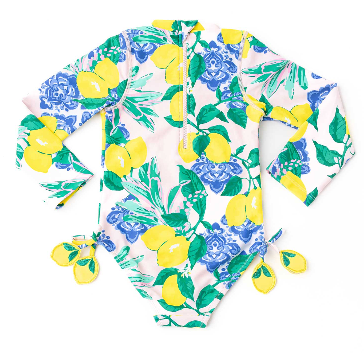 The Shade Critters Santorini Citrus girls rashguard swimsuit features a stunning lemon print with cobalt blue accents inspired by the Greek island of Santorini. Easy on and off with a zippered back. And she will love the dangling embroidered lemon detailing. This collection includes multiple swimsuit styles for girls, including a one-piece swimsuit with lemon tie straps, a high-waisted two-piece, a bikini for tweens, and a rashguard swimsuit for added sun protection.