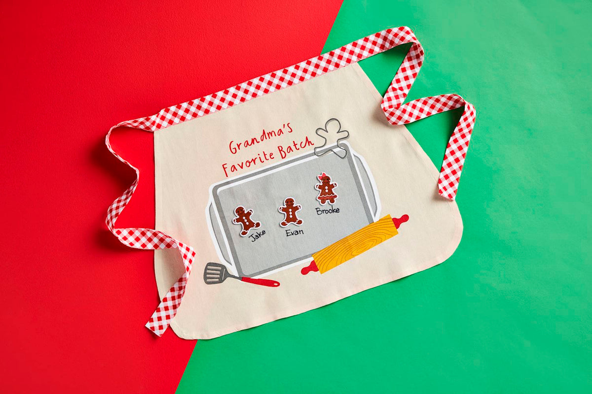 3-piece set: canvas half apron, set of 8 patches and fabric pen. Iron-on gingerbread patch to represent each grandchild, then personalize with name underneath.